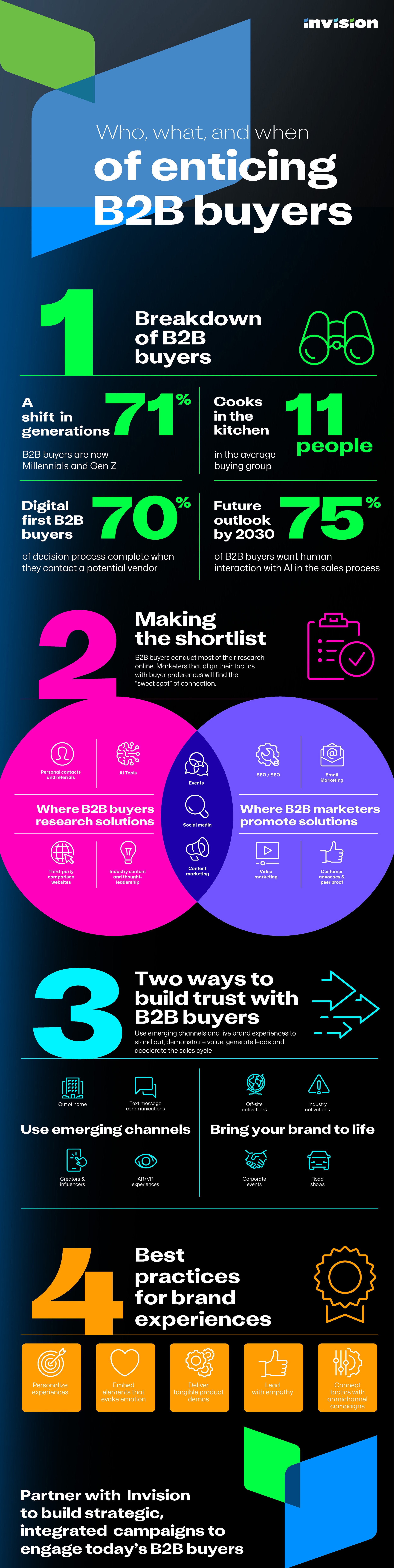 This infographic illustrates who makes B2B purchasing decisions today, where they go to find information about their potential purchases (hint, it’s unlikely to be an unsolicited email), the benefits they get from connecting in person, and how B2B marketers can marry their messages with buyers’ preferred channels and make their live brand experiences stick in buyers’ minds.